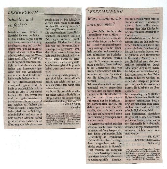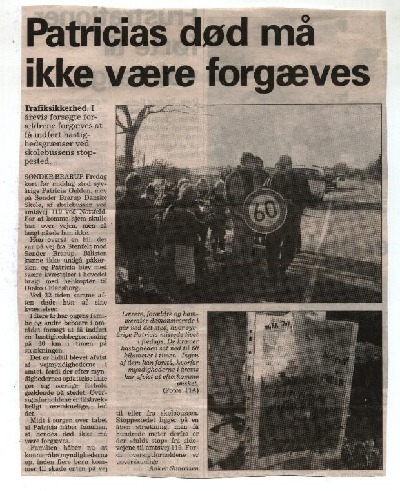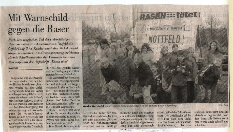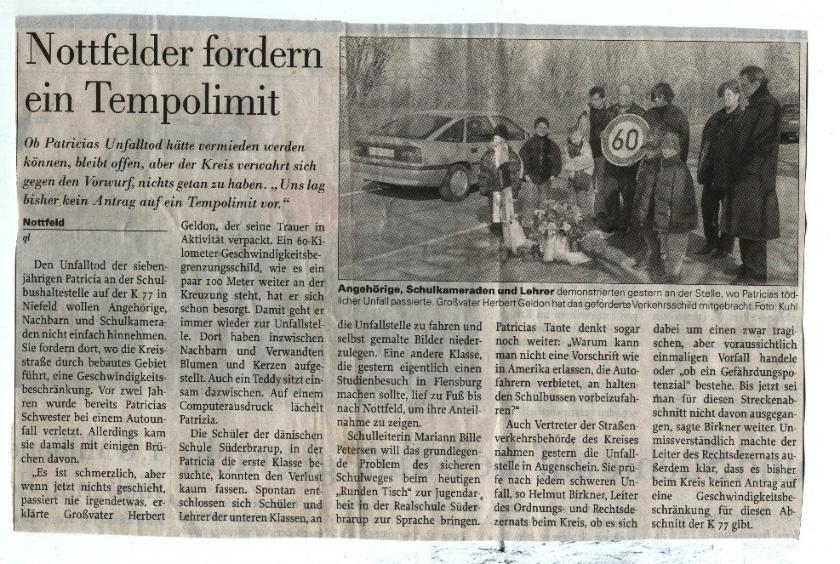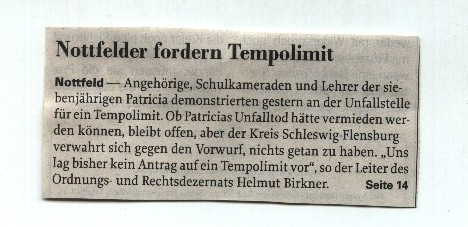 Herbert, Patricia´s Opa kämpft seit dem Unfall, um eine Geschwindigkeitsbegrenzung. Auf dieser Straße sind 100 Km erlaubt. Laut Tüv-Gutachten, wäre der Unfall bei einer Geschwindigkeit von 60 Km nicht geschehen. Der Kreis hat den Antrag bisher abgelehnt. Täglich steigen Kinder an der Haltestelle ein- und aus. In 2 Jahren wird Vivien den gleichen Weg zur Schule gehen. Wir hoffen, dass die Behörden irgendwann ein Einsehen haben.